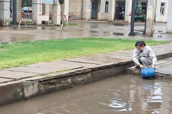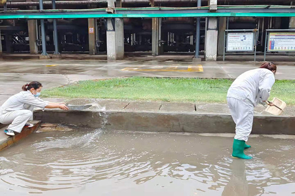 無論刮風(fēng)還是下雨,天氣有多惡劣 ,總有一群人,她們始終是堅(jiān)守在崗位一線的最美員工,那就是從事質(zhì)檢分析的女工們。其實(shí)在四班三倒的日子里,她們最頭疼的不是工作忙,而是遇見雨雪天氣,特別是下雨天時,出門去現(xiàn)場取樣就變得困難了很多,有時候?yàn)榱巳臃奖,她們寧愿選擇不打傘、不穿雨衣,一趟下來,衣服和鞋子差不多全濕透了。這不,那一晚她們就迎來了一夜的雨,從小雨逐漸變成中雨,聽著外面的雨聲,她們?nèi)缱槡郑f一變成暴雨可怎么辦,雨一直不停又怎么辦,外面的雨已經(jīng)越下越大,但到了取樣時間她們不畏困難做好防護(hù)準(zhǔn)時到現(xiàn)場取樣,她們堅(jiān)信遇到再大困難也要戰(zhàn)勝困難,去完成自己的工作。終于等到了天亮,雨也停了下來,等待她們的就是清理積水。看著那么一大片積水,沒有抽水泵,這讓她們犯起了難,思考了片刻,她們決定用最老土的辦法使用水桶、笤帚、簸箕清理積水,說干就干,水比較深,只好換上了雨鞋,大家分工明確,掃地掃,鏟地鏟,提得提,倒得倒,一會的功夫積水已經(jīng)少了很多,在大家緊密的配合下,最終把坑里積水全部清理了出去。
