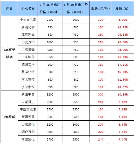 從表1來看,國內(nèi)主要燒堿廠家紛紛上調(diào)出廠報價,其中中鹽吉蘭泰等廠家曾在一個交易日內(nèi)兩度上調(diào)報價,心態(tài)強烈可見一斑。在開工基本穩(wěn)定、市場供應充足的背景下,廠家之所以迅猛上調(diào)出廠報價,主要是受江蘇危化品禁運消息影響。自9月20日起,江蘇地區(qū)禁運危險品,在無法就地處理燒堿副產(chǎn)品液氯的情況下,當?shù)夭糠譄龎A企業(yè)只能選擇降負荷或停工,燒堿供應預期大幅減少。因此,江浙一帶燒堿企業(yè)惜售心態(tài)強烈,自9月初開始,大幅輪番上調(diào)出廠報價,其中漲幅最大的要數(shù)寧波萬華。