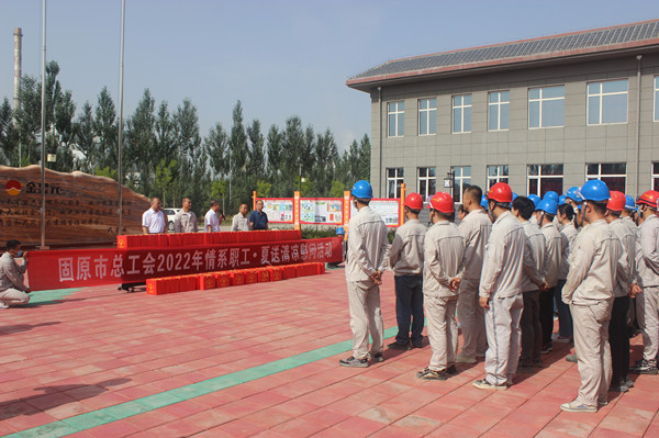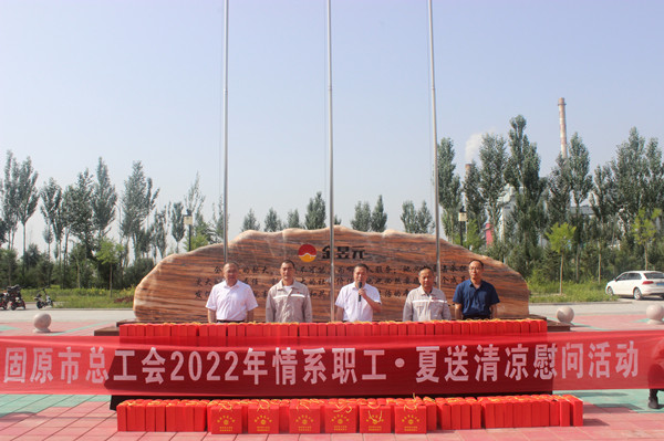 7月8日上午,固原市總工會常務副主席王志賢、開發區總工會常務副主席羅天、開發區管委會規劃建設局副局長海濱一行,蒞臨寧夏金昱元化工集團股份有限公司固原片區,為堅守在生產一線的員工送來防暑降溫用品。
