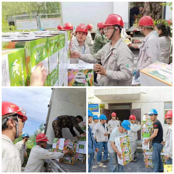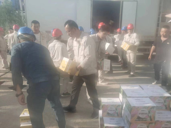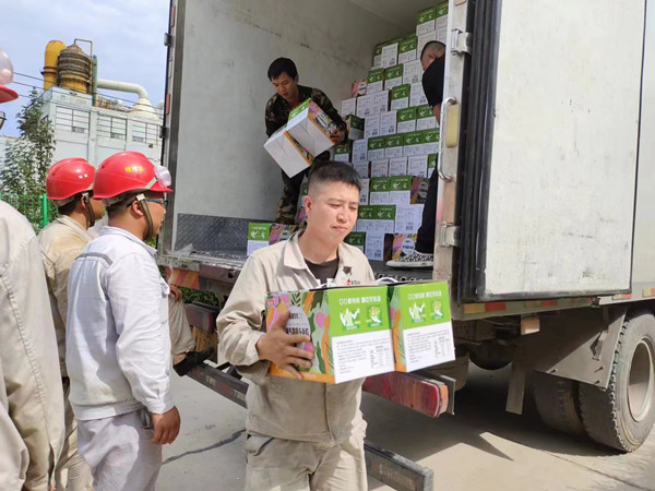 工作人員將防暑品送到生產(chǎn)一線,將濃濃關(guān)愛送到員工們手中,員工們?cè)诳釤岬南奶烊顼嫺嗜袂鍤馑?