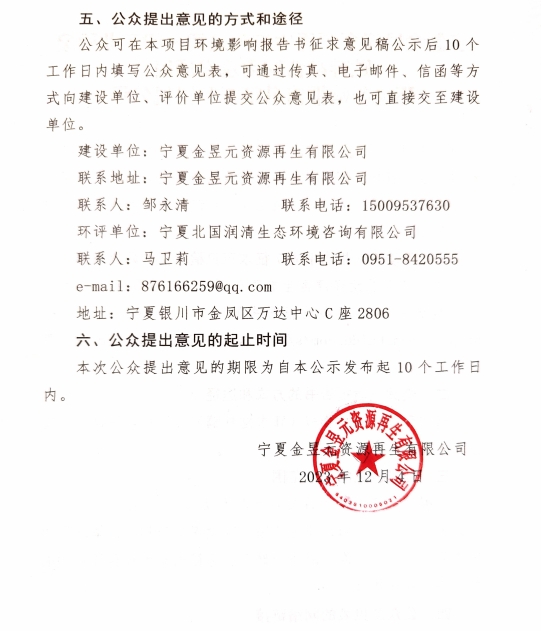 寧夏金昱元資源再生有限公司一般工業固廢貯存綜合利用建設項目征求意見稿公示
